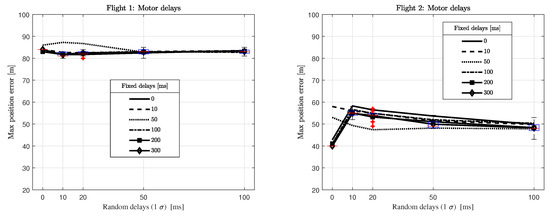 Figure 6 depicts the average of the maximum position error for all runs. The max. error in position for all runs for the larger fixed delay considered (300 ms) are presented as a box-plot. In each box, the central mark indicates the median of all runs, and the bottom and top edges of the box indicate the 25th and 75th percentiles, respectively. The whiskers extend to the most extreme data points not considered outliers. The outliers are plotted individually using red ‘+’ symbol. The motor time-tagging errors seem not to introduce a noticeable deterioration of VDM-based navigation performance compared to the case with perfect time-tagging. A possible reason is the slow dynamic response of the UAV to the propeller speed, which creates the relatively small time-tagging errors (with respect to associated dynamic modes of the UAV) causing very little impact on navigation. Indeed, the absence of wind in the simulation and the nominal and almost constant velocity of the platform during both trajectories imply a very low dynamic in the change of propeller speed, simplifying the model. Larger errors in position are expected if those two conditions are different, i.e., wind is present or added in the simulation and the platform changes its velocity during the flight.