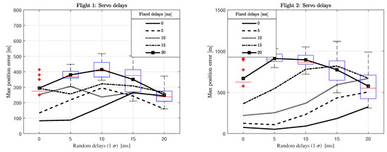 Considering the high sensitivity of UAV dynamic response to servo data time-tagging errors, the chosen fixed delay and random noise standard deviation were limited within a range from 0 to 20 ms as shown in Table 3. The effect of those errors on max. error in position is plotted in Figure 7.