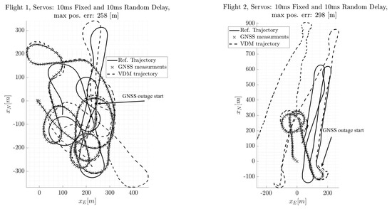 Figure 8 shows the VDM-based navigation solution both with an introduced fixed and random (standard deviation) delay of 10 ms in the servo data for a particular run. The maximum position error during a GNSS outage for both flights is around 300 m, i.e., about three times larger than the nominal scenario, although the trajectory dependency of dead reckoning methods makes the direct comparison between trajectories less relevant. Note that the magnitude of vertical errors are limited by the barometer measurements. In addition, as explained in Section 2.3, there is an in-flight refinement of the VDM parameters when GNSS data are available. Flight 1 lasted 152 s longer than Flight 2 and experienced more dynamic maneuvers, therefore it is reasonable to expect a finer estimation of the VDM parameters resulting in a slightly better performance in autonomous navigation.