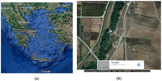 (a) The study area of Aggitis River in Greece; (b) The selected reach of Aggitis River compared to the existed road network. Source: Google Maps.