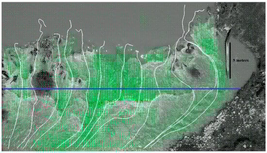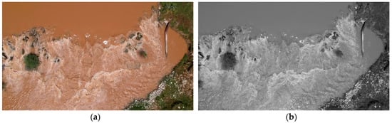 The PIVlab software was developed by Thielicke and Stamhuis as a Graphical User Interface (GUI) in MATLAB (MathWorks®) for the particle image velocimetry analysis [], but it can also be utilized in LSPIV applications []. It is a free software, downloadable from the internet, while it provides tutorials in order to be user-friendly. More specifications can be found in its tutorials and examples []. The image analysis in PIVlab was performed on the georeferenced extracted images (200 frames based on the minimal movement of the drone to reduce errors). The analysis was done at a continuous sequence of frames. Multipass window deformation was applied with two interrogation passes: (i) 64 to 32 px2 and (ii) 32 to 16 px2. Both unreliable high vectors and misleading riparian vectors were deleted during the post-processing of the images. The analysis lasted 15 min, based on the capabilities of the computer and the number of frames that were selected. Figure 2a represents a frame extracted from the captured video by the drone while Figure 2b is the greyscale image used for the image velocimetry.