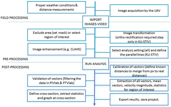 KU-STIV is a software developed by Fujita and his team to apply the STIV method []. KU-STIV combines various algorithms: the displacement, rotation, and size change between the consecutive images are detected by using the algorithm known as RIPOC, while the algorithm named SIFT is used to detect feature points in the respective image and record the track based on the coordinates of the detected feature points []. This software also provides a stabilization method for the videos but, also, an orthorectification option if the images are captured at oblique angles. The velocity is estimated upon parallel lines to the water flow, predefined by the user, and not in the entire field of the image. Finally, the software requires a license in order to use it. The following figure, Figure 3, illustrates the flowchart of the methodology followed in the present study for all three software.