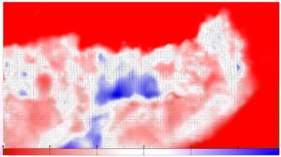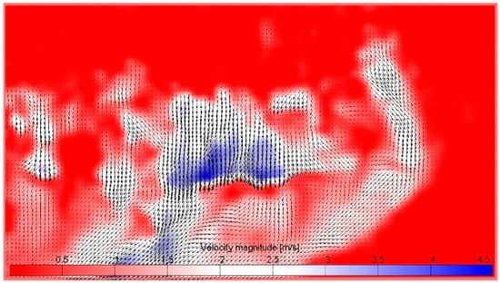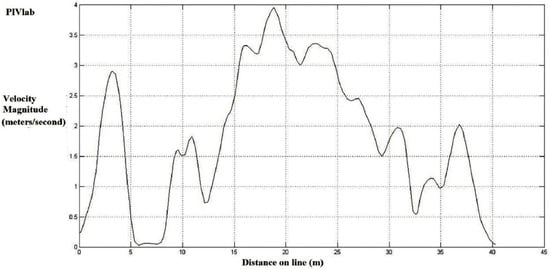 Figure 6 illustrates the overall mean velocity magnitude of the cross-section results in PIVlab. The colored bar depicts the low (red), medium (white), and high (red) velocity values. The greater velocity is depicted in the central part of the river, due to the low depth and absence of obstacles, while there are also two paths at the left and right sides. The two positions where the velocity is low are because of the existing vegetation and rocks that were also depicted. The part of the river upstream with the constructed barriers is represented as expected, with zero or very low velocity because there were no sufficient turbulence patterns to acquire the velocity field. Figure 7 is the produced graph that displays the velocity magnitude, from the left to the right bank, at this cross-section based on PIVlab. The greater velocity (>2.5 m/s) occurs in the central part of the river between 17 and 23 m from the left side of the bank, due to the non-existence of great obstacles. There are two points where the velocity is close to zero at 5–7 m and 38–40 m from the left side of the bank, because of the existing vegetation and rocks.