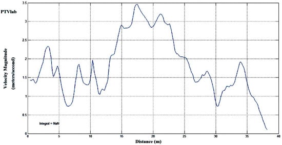 In a similar way, Figure 8 depicts the overall mean velocity magnitude of the section produced by the application of PTVlab. The same colored bar corresponds to the low (red), medium (white) and high (red) velocity values. The greater velocity is depicted in the central part of the river due to the low depth and absence of obstacles, while there are also two paths at the left and right sides. The two positions where the velocity is low because of the existing vegetation and rocks are also depicted. The part of the river upstream with the constructed barriers is represented as expected, with zero or very low velocity because there were no sufficient turbulence patterns to acquire the velocity field. PTVlab also provides graphs, and Figure 9 is the produced graph that displays the velocity magnitude, from the left to the right bank, at this cross-section. The graph is almost identical to the one produced in PIVlab, and its velocities range from 0.12 to 3.44 m/s. There were minor differences, e.g., at 7 m where the velocity is 0.7 m/s (PTV) instead of 0 m/s (PIV), or at 10 m where the velocity is 2 m/s instead of 1.5 m/s (PIV).