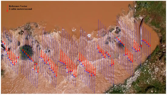 The results of the LSPIV analysis using PIVlab are depicted in Figure 4. The green arrows are the mean calculated velocity vectors that show both direction and magnitude. The vectors are visible only in the location where natural patterns occurred. There were no visible tracers over the constructed barrier requiredo produce the velocity field. There are many reasons for this absence, such as (a) the period that the measurements were taken had no leaves or branches carried by the river flow, (b) the river was muddy and it was therefore difficult to distinguish any floating particles, and (c) the height of the flight was at 40 m, so it was impossible to record sufficient particles in size. A known distance must be defined to convert the pixels of the frame to real dimensions. The black line depicts the known distance of the pipe as measured at the site. PIVlab and PTVlab are both able to produce the streamlines or the flow paths depicted in Figure 4 as white lines. They also have the capability to provide statistics and graphs based on the designed cross-sections or areas. The purple line is the cross-section of the specific reach of Aggitis River. Figure 5 represents the vectors of the PTV analysis in PTVlab.