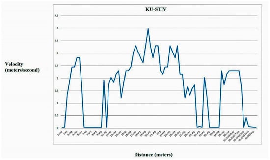 Different studies have compared different software of the same method [] or different software with other methods to measure stream velocity [,]. To our knowledge, this is the first time that these three software/methods have been compared to each other using the same dataset. All three methods produced similar results, as depicted in previous figures (4 to 12). There were minor changes over specific locations (e.g., 7 to 10 m, and 30 to 34 m) of the reach where the velocity had different values, but the overall trend was almost identical in most measuring locations. In particular, the similarity between the LSPIV and LSPTV analysis was very high because of the high visible natural patterns (surface ripples). The peaks can be observed at the same locations for all three methods. The PTVlab analysis produced lower values at the peaks. As expected, surface velocity was higher (maximum velocity was equal to 3.98 m/s for PIVlab, 3.44 m/s for PTVlab, and 3.99 m/s for KU-STIV) in the center of the river, and decreased near the river banks due to greater friction []. Water velocity was estimated only in the parts where visible surface ripples existed. There is a part over the constructed barrier where there were no visible moving particles, and it was not possible to estimate the surface water velocity. Both the PIVlab and the PTVlab are free software, downloadable from the internet and user-friendly, as they have a GUI, but they require MATLAB in order to use them and each needs a different version of MATLAB.