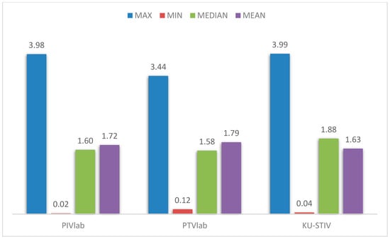 The KU-STIV software was also applied, and the produced results can be seen in Figure 10. The software cannot represent the same field as PIVlab and PTVlab. It estimates the velocity vectors only in defined lines parallel to the water flow. For this reason, the results are not depicted in a colored scale bar, while the vectors (red arrows) follow the direction of the defined parallel lines to the water flow. KU-STIV can also extract the velocity magnitude over a defined cross-section, as represented in Figure 11, that is also very similar to the other two produced graphs. In addition, a bar chart (Figure 12) was produced to depict the maximum, minimum, median, and mean values of the surface velocity at the specific cross-section for the three software used in this study. The velocity ranges are 0.02–3.98 m3/s for PIVlab, 0.12–3.44 m3/s for PTVlab, and 0.04–3.99 m3/s for KU-STIV software. The median values are similar for PIVlab and PTVlab (~1.6 m3/s) while greater for KU-STIV software (1.88 m3/s). On the other hand, the mean value from the KU-STIV is lower (1.63 m3/s) than the other two software that have close values (1.72 m3/s for PIVlab and 1.79 m3/s for PTVlab).