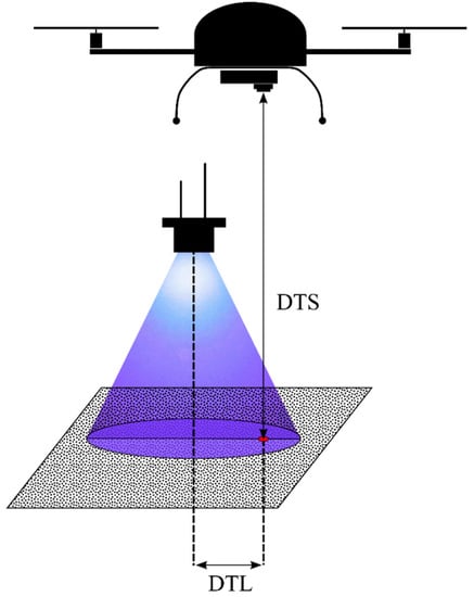 Concept of the conducted survey. The unmanned aerial system (UAS) (DJI Mavic Pro) carried the camera system. Hand-held UV-light source is displayed. The red dot indicates the fluorescent tracer patterns that varied in two different sizes (1 mm² and 4 mm²). Images were taken in two different heights, measured as the distance from the object to the camera sensor (DTS). In subsequent image analyses, the distance from the center of the light source to each individual tracer was calculated (DTL).