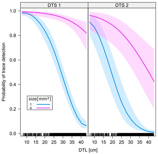 Dependency of the probability of the fluorescent trace detection on the distance between the UV radiation source spot projection center on the ground and the fluorescent traces (DTL in cm, but differences were measured based on 1 mm scale) for two different distance levels (DTS) between the UAS sensor and the traces (panel 1 left side: 2.2 m to 2.7 m; panel 2 right side: 3 m to 3.65 m). Tracer size varied between 1 mm2 (size 1, blue solid lines) and 4 mm2 (size 4, red solid lines). Blue and red areas represent 95% confidence intervals of the predicted values.