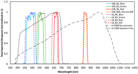 The spectral response functions of the LI-200R pyranometer and LI-190R quantum sensor in relation to Landsat 8 and Sentinel-2 satellite sensors are shown in Figure 2. The spectral response functions for the spectral bands sampled by the satellite sensors show a broad similarity in both position and bandwidth. The spectral response function of the quantum sensor is wide enough to cover the blue green and red spectral bands sampled in the visible range by the satellite sensors. The large difference, however, is between the satellite sensors and the pyranometer, and whilst the broadband pyranometer samples across the entire VIS-NIR spectrum, the contributions are weighted towards the NIR, with relatively less signals coming from shorter visible wavelengths, particularly in the blue-green region.