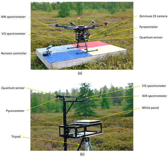 The system is composed of a UAV sub-system (Figure 3a) and a ground sub-system. The UAV sub-system includes a camera and four radiations sensors (Figure 3): one from each pair mentioned above. The camera is mounted using DJI 3-axis gimbal system onto the Matrice 600 and stream live HD video to the DJI or Litchi apps. One pyranometer and one quantum sensor are connected with a CR300 data logger and mounted on the UAV. Similarly, one VIS spectrometer and one NIR spectrometer are connected to a microcomputer and mounted on the UAV. The data logger and the microcomputer are powered by a separate Lithium-Ion battery. All the sensors are mounted on the UAV using a light-firm aluminum frame and are pointing down for measuring reflected radiation from the land surface.