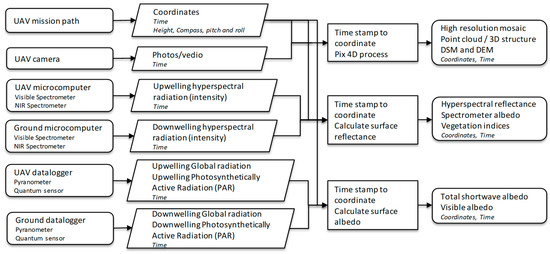 The data is processed using the workflow described in Figure 4. Data regarding the operation of the UAV including time, coordinates, speed, altitude, compass, pitch, roll, and information about the gimbal and camera are recorded in the system mission path file. Multispectral camera, ground and UAV data loggers (pyranometers and quantum sensors are connected) and ground and UAV microcomputers (VIS and NIR spectrometers are connected) write a millisecond level timestamp (from turn on time) and a real-world timestamp, based on their system’s time, in their data files. Therefore, it is very important to synchronize the internal clocks to an accuracy of 1 second on all devices such as, the iPad, laptop, ground and UAV data loggers, and ground and UAV microcomputers. The timestamp is the common field (link) of all the datasets from the camera and the sensors, and is used to get the coordinates of the photos and sensor readings. The downward sensors are aligned within the airframe so that they are level when the UAV is in stable flight. Though the M600 is comparatively a stable platform, having stable flight is not always possible as the UAV platform orientation varies due to wind, its own rotation, and instability during acceleration and deceleration. Errors due to instrument tilting can be limited by omitting radiation data recorded when the pitch or roll of the UAV exceeded 3° [14].