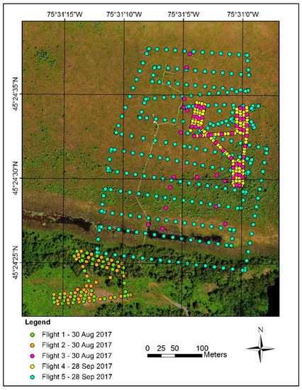 An orthomosaic and point cloud for the Mer Bleue wetland from a mission on 28 September 2017 provides a characterization of the area (Figure 7). The orthomosaic with 1cm spatial resolution provides information on surface texture and land cover type with high accuracy at locations where surface albedo was measured. The point cloud contains 24.5 million points over 1.85 ha and are visualized with natural (visible) colors and color coded for height. All points in the cloud are between 69.8 m (blue) and 75.4 m (red) above sea level (ASL). This gives detailed vegetation density and structural information. Vegetation at the Earth’s surface has various levels of structural formation. Open canopies (grass, marsh, open bog) generally have simple structures with leaves more or less randomly distributed in space, whereas foliage in closed canopies (treed bog, forest) are often organized in structures at various hierarchical levels, such as shoots, branches, whorls, tree crowns, and tree groups [37]. This structural information is useful to understand and interpret surface anisotropic and BRDF characteristics, which directly influence surface albedo estimates.