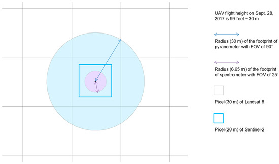 The field of view (FOV) specifications and on-ground sampling footprint of the UAV-mounted spectrometer (6.65 m radius) and pyranometer (30 m radius) in comparison to 30 m Landsat 8 and 20 m Sentinel-2 pixels.