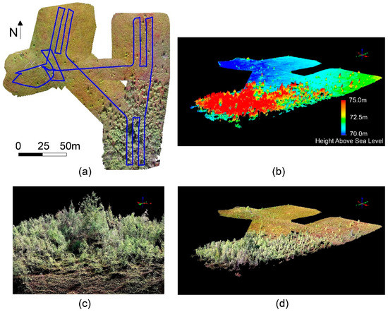 (a) Orthomosaic, (b) height above sea level and (c,d) point cloud showing land cover and vegetation structure of Mer Bleue Bog area (28 September 2017—Flight 4).