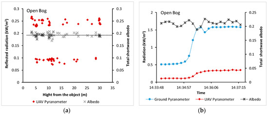 The total shortwave albedo measurements have been made using instruments such as pyrometers, positioned either on tripods (~3 m in height) or on towers, of 20 m or greater in height [38]. With this stable UAV system, we could measure the surface albedo at different heights (~3 m and higher). The surface albedo measured using the UAV pyranometer is not influenced by the observation height where the land surface is homogenous. Total shortwave albedo measurements over a homogenous bog area at different heights under clear sky or cloudy conditions gives very consistent albedo values (Figure 8a). Further, total shortwave albedos under clear-sky conditions and those under cloudy conditions are almost equal and stable (see Figure 8a,b). Liang et al. [39] stated that under cloudy conditions, the total shortwave albedo is different from that of the clear-sky conditions since the spectral distributions of the downward irradiance at the surface are different. In this study, the differences (Figure 8a,b) were found to be insignificant, which is partially due to minimal atmospheric influences in the measurements.