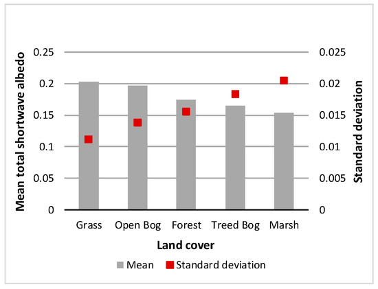 Mean and standard deviation of total shortwave albedo of different land cover types.