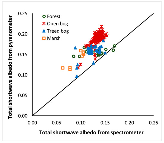In previous studies, validation of satellite-retrieved albedo using directly measured albedo from radiation sensors was usually conducted with fixed, ground or tower-mounted instruments [38]. The novel use of an on board, UAV-based sensors allows direct albedo measurements in a spatially-continuous manner and provides opportunity to validate satellite estimates using more validation points and, importantly a variety of land covers. Other than that, by averaging multiple UAV-derived albedo values within one pixel of remote sensing image, the issue of upscaling from point measurement to the pixel level can be alleviated. In this case, 50% of contributions to the pyranometer albedo are coming from outside of the 60 m diameter footprint that is compared with aggregated Landsat 8 and Sentinel-2 60 m pixels. Greater uncertainty and error will arise when this is within a heterogeneous landscape, and particularly in landscapes where the albedos from different land covers are very different from each other, such as treed bog adjacent to open bog.