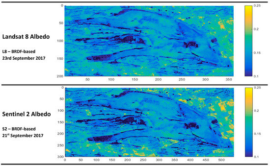 Whilst the weighting functions in Equations (4) and (5) were developed for Landsat 5 TM bands, corresponding bands over the same spectral range from Landsat 8 and Sentinel-2 data have similar characteristics, including centre wavelength position and the full width half maximum. Nonetheless, this may impact on the overall absolute accuracy of derived albedo products and their agreement [35].