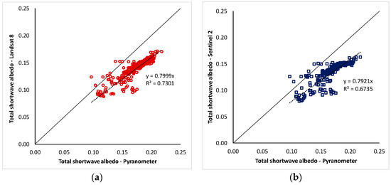 Comparison between satellite-derived albedo using the BRDF-based approach for (a) Landsat 8, and (b) Sentinel-2 sensors, against directly measured albedo from pyranometer.