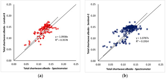 Comparison between satellite-derived total shortwave albedo using the BRDF-based approach for (a) Landsat 8, and (b) Sentinel-2 sensors, against spectrometer-derived total shortwave albedo.