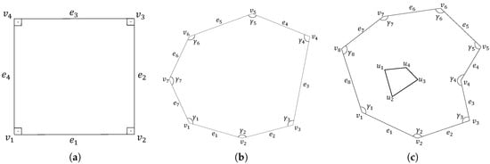 The area of interest can be represented by a sequence of p vertices . Each vertex can be described by a pair of coordinates , while its internal angle can be referred by . Considering , the following vertex of the polygon can be described as , where mod . An edge located between two vertices and can be referred as , while its length by . Furthermore, the area may contain internal NFZ depicted as a sequence of obstacle-points . Figure 1 shows three examples of an area.