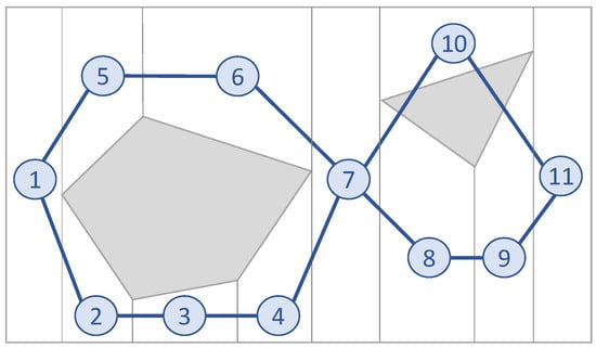 Xu et al. [30] and Xu et al. [48] present an optimal coverage algorithm for fixed-wing UAVs able to avoid flights in obstacle-regions with arbitrary shapes and previously explored regions. The area of interest is decomposed into a simple set of cells using Boustrophedon Cellular Decomposition (BCD), originally proposed by Choset and Pignon [49], in an offline phase through a bitmap representation. The BCD is an exact cellular decomposition able to work with non-polygonal obstacles, which presents more efficient coverage paths than the trapezoidal decomposition. From the decomposition, an adjacency graph can be built with the vertices representing the cells and the edges connecting the adjacent cells, as illustrated in Figure 12.