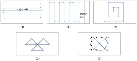 Some approaches explore only rectangular areas, according to Andersen [38], where the author compares different types of flight patterns. In this work, the back-and-forth pattern is classified into parallel and creeping line, as illustrated in Figure 5a,b, and it is preferable when the search area is large and there is no information about the likely target meeting point. The square flight pattern consists of straight lines and 90 turning maneuvers to the right side. The pattern starts at the central point and extends towards the borders, following a pattern similar to an ellipse shape, and it is normally employed when a uniform area coverage is desired, as shown in Figure 5c.