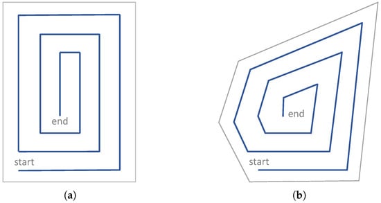 A convex decomposition method to split complex shapes into smaller shapes and transform concave shapes with sharp edges into convex shapes is presented by Öst [29]. The author explores the back-and-forth and the spiral motion, as illustrated in Figure 13, combining them with the proposed area decomposition technique. The authors claim that back-and-forth pattern with no area decomposition presents reliable outcomes with respect to different combinations. This confidence is because all maneuvers have 90 turns, which allow us to predict the pattern after four moves. Despite generating slightly longer paths, this pattern is capable of handling complex shapes without losing coverage. However, the algorithm consumes a considerable time testing all different rotations in the polygon between 0 and 180 to find the optimal motion direction.