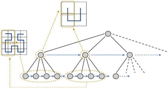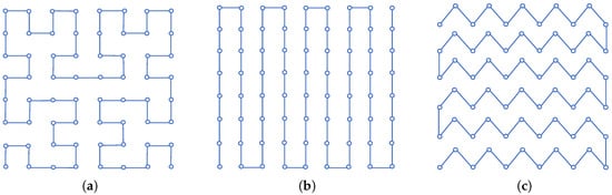 Energy-aware algorithms for smoothing trajectories are presented by Artemenko et al. [31]. The authors observed that a UAV spends a lot of time and energy making turns, once the vehicle has to decelerate, rotate and accelerate every time it performs these maneuvers. Thus, using the concept of Bézier curves, the algorithms modify conventional trajectories such as SCAN (back-and-forth), HILBERT, and LMAT, shown in Figure 8, by smoothing maneuvers along a given path. A more effective turning maneuver can be performed smoothing the movement with minimum deceleration. The authors compare the modified trajectories with the conventional ones and conclude that the new trajectories are able to reduce the amount of energy and time spent, keeping the level of the localization accuracy (LoLA).