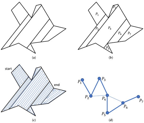 An exact cellular decomposition approach considering concave polygonal areas is explored by Jiao et al. [43], Li et al. [44]. Initially, the workspace is decompounded in non-concave sub-areas through a minimum width sum approach exploring a greedy recursive method previously proposed by Levcopoulos and Krznaric [45]. Then, back-and-forth motions perpendicular to the sweeping direction, which is the minimum distance between an edge and a vertex, are performed in order to minimize the turning maneuvers [46]. Two sub-regions entirely adjacent and with the same sweep direction, obtained from the convex decomposition (from Figure 9a), are combined into the sub-region P4 to avoid unnecessary back-and-forth moves, as revealed by Figure 9b. It is also possible to change the motion direction from one sub-region to another in order to obtain a coverage improvement, as shown in Figure 9c. Finally, the optimal sequence of sub-regions is defined to join the final trajectory, as illustrated in Figure 9d.
