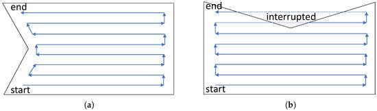 Coverage using back-and-forth pattern in concave polygons: (a) Non-interrupted path; (b) Interrupted path.