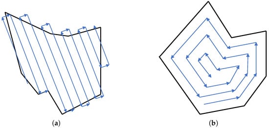 Simple flight patterns in polygonal areas: (a) Back-and-Forth; (b) Spiral.