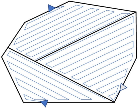 Another coverage approach exploring the exact cellular decomposition for convex and concave areas is presented by Torres et al. [35]. The authors aim to capture pictures using aerial vehicles in order to achieve a 3D reconstruction. Convex polygons can be swept by BF motions according to the optimal direction. However, in more complex areas as concave polygons, it is needed to check if the mission can be performed in the same way with no gaps during the stripes, i.e., none of the stripes cross a part outside of the polygon. This particular case is illustrated in Figure 10a. When the path is interrupted, as shown in Figure 10b, an exact decomposition of the polygon is used to simplify the area creating sub-regions.