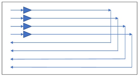 An energy-aware spiral CPP algorithm (E-Spiral) is proposed by Cabreira et al. [40] for regular-shaped areas of interest. The algorithm consists of building a coverage path passing by each vertex of the area. Once the first coverage layer is completed, the algorithm should reduce the radius in order to move the vehicle towards the central point, as illustrated in Figure 7. The algorithm performs turning maneuvers with wider angles and does not need to reduce the speed to zero on every turn, which decreases the acceleration and deceleration periods. This behavior keeps the optimal speed adopted in straight segments of the path for longer periods, providing an even more effective energy saving than the one proposed by Di Franco and Buttazzo [25].