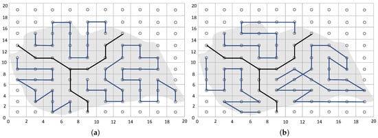 Exploring all permutations may consume an elevated computational time depending on the number of sub-regions. Thus, the authors use only the adjacent sub-regions for the transitions, reducing the number of permutations. The proposed approach was evaluated in two scenarios. In the first scenario, a concave area is decomposed in five sub-regions pondering only four adjacencies. The authors drastically diminish the amount of permutations and the computational time spent generating a solution with an insignificant increment in the total distance. In the second scenario, the approach is compared to the one proposed by Li et al. [44] using the same area, as shown in Figure 11. The proposed approach decomposes the area into only four sub-regions, computing only 80 turning maneuvers against 87 of the original work.