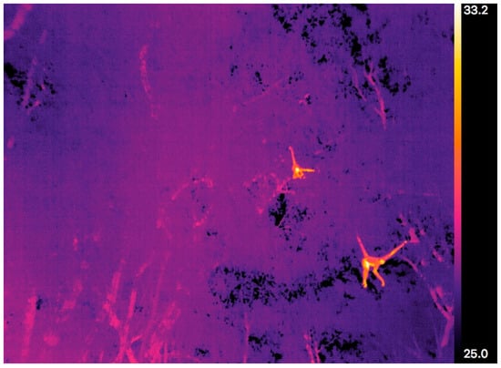 Example of preliminary ground survey data taken with the thermal camera unmounted from the drone. Two spider monkeys are visible in this figure. Temperature scale for false colour thermal image is shown on the right-hand side. Using these data, we expected the surface temperature of spider monkeys to be around 30 °C.