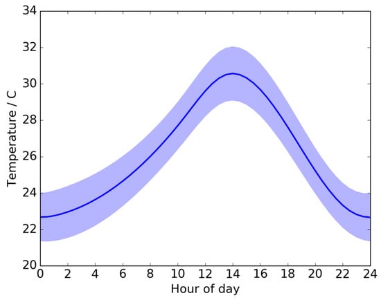 The 24-h temperature range of the land surface for Los Arboles Tulum during June. Figure generated from satellite observations of the land surface over several years, following the method described in Burke et al., 2018 [32]. The line indicates the climatological mean temperature, and the shading indicates the 2-sigma (or 2 standard deviation) range for land surface temperatures.