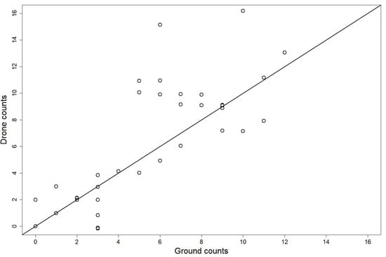 To test the agreement between counts from drone and ground surveys, we performed a concordance analysis [35]. Typically, the results from a new method are compared to the results from an existing method to determine if the new method can replace the existing one [36]. We considered ground counts as the existing method because primates are traditionally counted via line transect or point surveys [37]. We matched counts from ground and drone surveys collected during the same drone flight, creating pairs of counts of individual monkeys in each subgroup that were within the same visual field of both the ground observers and the TIR drone camera.