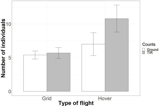 Mean number of spider monkeys ± standard error counted for the same visual field from the ground and from TIR drone surveys for grid and hover flights.
