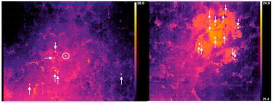 Examples of TIR images obtained from the Fusion camera whilst mounted on the drone recorded during a flight at 19:30 on 20th June 2018 at sleeping site A (left) and 05:45 on 20th June 2018 at sleeping site B (right). Drone height for both flights was 70 m above ground level, approximately 40–45 m above the canopy. Temperature scale corresponding to false colour thermal image is indicated on the right-hand side. Locations of spider monkeys are indicated with arrows. The circle indicates a human observer counting monkeys on the ground. Some sources of possible confusion when examining thermal infrared data are also visible in these images, particularly in the evening survey (left). Several branches have been heated by the sun during the day and appear as bright thermal sources.