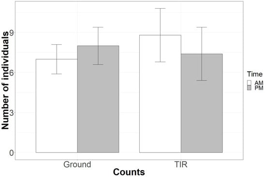 Conversely to our findings, Kays et al., 2019 [23] found that ground counts were higher than drone counts. However, they compared counts from only two flights, whereas we compared counts from 28 flights. Kays et al., 2019 [23] also used a lower resolution TIR camera than ours, and TIR camera resolution has been shown to strongly affect the detectability of animals from a drone [32]. As our study was performed at sleeping sites, most monkeys were relatively stationary and therefore potentially easier to detect on TIR footage as mobile individuals may go in and out of view while moving through the canopy. Ground surveys are often carried out when primates are most active (i.e., in the early morning and late afternoon), as their movement through the canopy can aid detection [44,45]. Ground surveys may therefore be more accurate than TIR drone surveys during hours of the day when primates are active, but their surroundings have started to heat up, minimising thermal contrast. Kays et al., 2019 [23] performed surveys when spider monkeys were more active and thus more difficult to detect on TIR footage, potentially explaining differences in results between the studies.