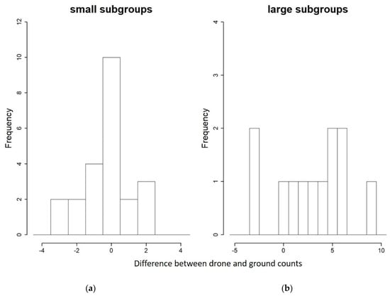 For 51% of all subgroups (n = 35), the difference in individual counts between ground and drone surveys was zero (11 cases) or one (7 cases). Lin’s coefficient for all subgroups was rc = 0.73 with a 95% confidence interval between 0.51–0.86. For 70% of all small subgroups (n = 23), counts from drone and ground surveys did not differ (10 cases) or differed by only 1 individual (6 cases; Figure 8a). Lin’s coefficient for the small subgroups was rc = 0.90; with a 95% confidence interval between 0.79–0.95, indicating agreement between the methods. For 83% of all large subgroups (n = 12), the drone counts were higher than the ground counts (Figure 8b). Lin’s coefficient was rc = 0.08; with a 95% confidence interval between −0.38 and 0.40, indicating that there was no agreement between the methods.
