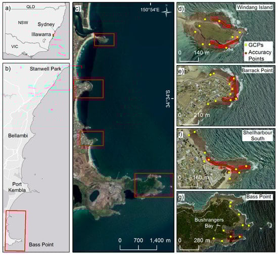 Figure 1. Rock platform site locations along the Illawarra coast. (a) Location of the Illawarra region. (b) Spatial extent (from Stanwell Park to Bass Point) of platforms investigated by []. Rock platforms investigated in this study (c). Rectangular area indicates platforms of Windang Island (d), Barrack Point (e), Shellharbour South (f) and Bass Point (g). Location of ground control points (GCPs) used to georeference the digital surface models (DSMs) and independent points used in the accuracy assessment of DSMs are shown in yellow and red, respectively.