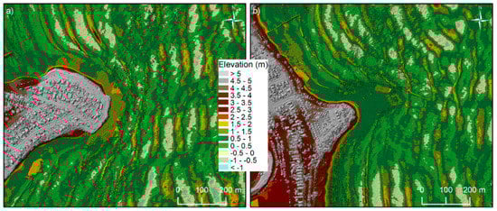 The RMSE for the DSMs reported here is considered within the range of reported RMSE values in the literature compiled by [], as the point-to-raster accuracy comparison is normally higher than other techniques (point-to-point or raster-to-raster comparison). This is based on the fact that the independent RTK-GPS datasets were validated against rasterised data products derived from SfM techniques, whose point cloud data were not used directly in the accuracy assessment. Furthermore, as an internal part of the georeferencing process, 3D position error of each GCP introduces an additional source of error into the SfM process, as indicated by the previously mentioned authors. When compared with the horizontal (0.8 m) and vertical accuracy (0.3 m) provided by the LiDAR supplier, the assessments presented in Figure 5 seem satisfactory. Furthermore, the discrepancies in the location of the seaward edge mapped using both techniques presented in Figure 8a,d indicate a consistent pattern between datasets (furthest seaward segments lower than the landward-most ones).