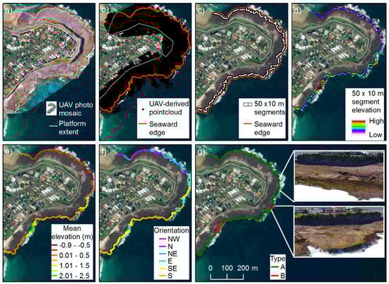 Figure 3. Example of the methodological process to derive morphometric parameters for Barrack Point platform. (a) Photomosaic showing platform extent polygon and UAV flight mosaic, draped on base map; (b) UAV-derived point cloud and seaward edge extracted from platform extent polygon; (c) 50 × 10 m segments; (d) elevation of segments; (e) segment mean elevation; (f) segment orientation; and (g) segment type showing both sloping (type A) and abrupt seaward edge (type B) morphologies. Oblique images representing both morphologies taken from Pix4Dmapper.