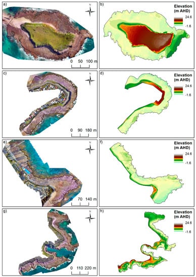Figure 4. Photomosaic (left) and DSMs (right) of Windang Island (a,b), Barrack Point (c,d), Shellharbour South (e,f) and Bass Point (g,h). DSMs were clipped using platform extent polygon. Elevation symbology has been standardised to allow comparison of DSMs. Links to Barrack Point and Shellharbour South models are available as Supplementary Materials.