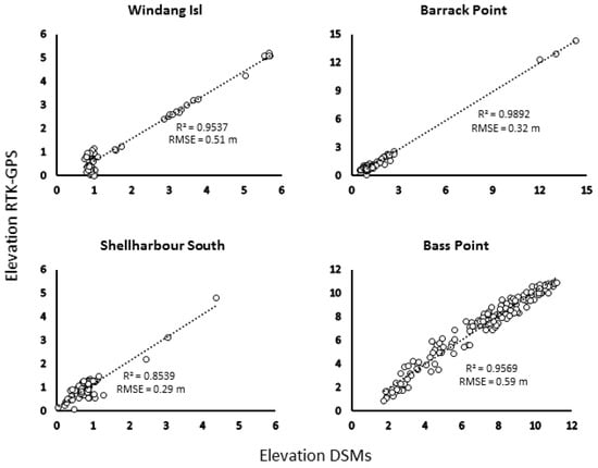 Accuracy assessment of the DSMs based on the coefficient of determination (R2) indicated a very strong relationship between the independent elevations obtained with the RTK-GPS and DSM-derived elevations. The strongest correlation was observed at Barrack Point (0.99) and the weakest was at Shellharbour South (0.85). The best RMSE was obtained for Shellharbour South DSM (0.29 m) and the worst one was Bass Point (0.59 m) (Figure 5).