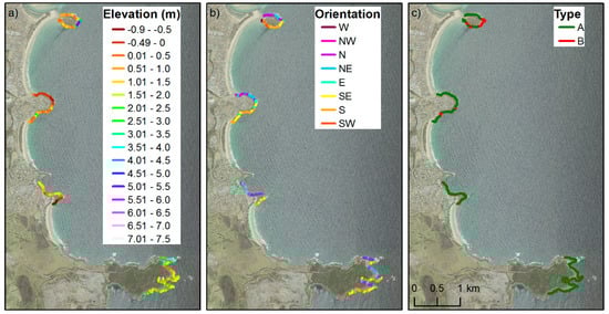 Orientation was incorporated because of the different exposure of segments in relation to the predominant swell direction, whereas the edge type was considered a suitable indication of the transformation of wave energy (in the absence of water depth data seaward of each platform), with sloping platform margins of type A serving to dissipate wave energy []. The classification follows that used on beaches where broad low-gradient dissipative beaches are characterised by waves breaking further offshore. In the case of rock platforms, significant dissipation occurs at wave breaking prior to wave arrival, or as waves arrive, at the seaward edge [], whereas type B morphologies are more analogous to intermediate-reflective beach states, as a great part of the wave energy is reflected by the seaward edge, especially at low tide []. Further information regarding the processing steps to calculate the morphological parameters can be found in [].