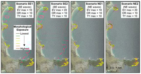 Type B, low elevation (up to 0.78 m AHD) segments, oriented to the predominant swell direction were determined to have the highest morphological exposure index, and could potentially score a maximum of 40 points depending on the scenario. Conversely, type A, high elevated segments facing the opposite direction to the predominant swell direction were considered the least hazardous, and could potentially score a minimum of 9 points depending on the scenario. Once all scenarios were calculated, ME values were classified into seven equal interval categories (lowest to highest) similar to the methodology adopted by [].